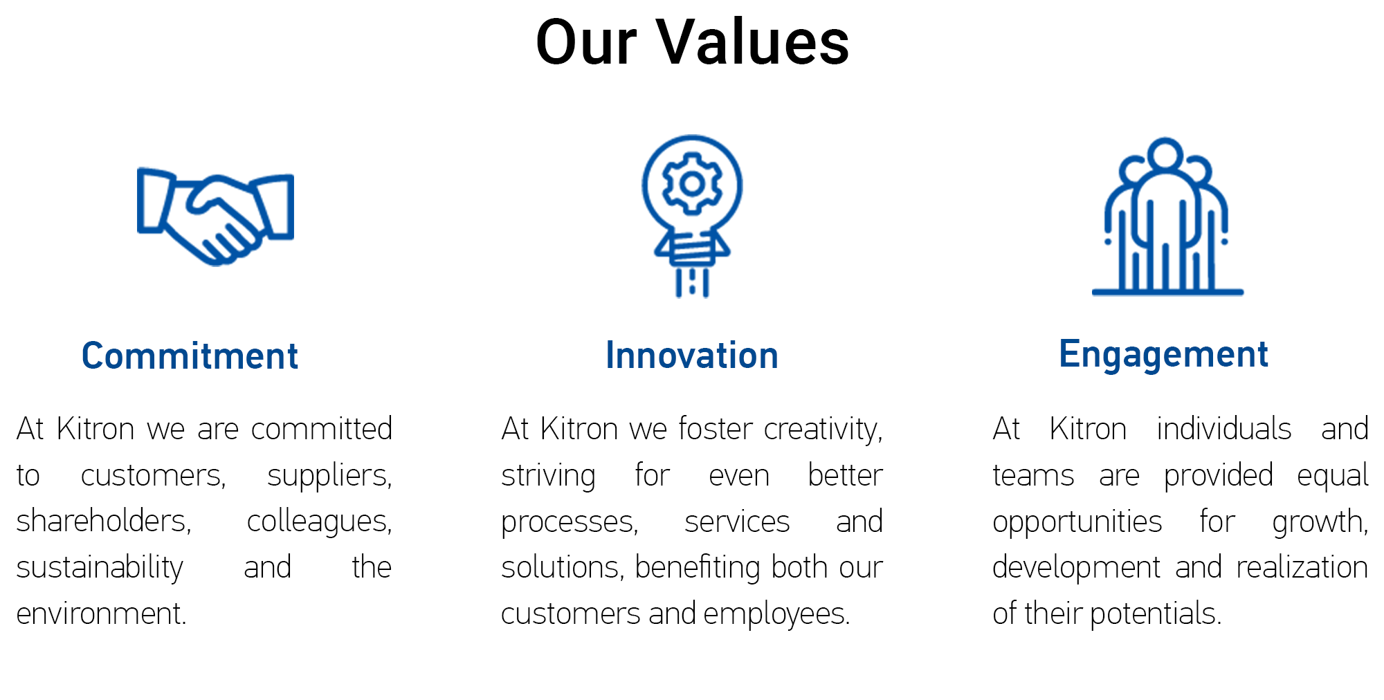 Kitron is a leading Scandinavian Electronics Manufacturing Services (EMS) company, delivering improved flexibility, cost efficiency, and innovation power through the value chain. The company has operations in Norway, Sweden, Denmark, Lithuania, Germany, Poland, the Czech Republic, India, Malaysia, China and the United States. With 3000 highly skilled employees, Kitron manufactures and delivers anything from fully assembled electronic circuit boards to complete end - products for customers globally. Related technical services like prototyping, industrialisation, material analysing and test development are also key competencies offered by Kitron.